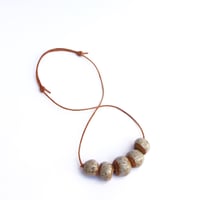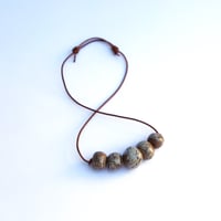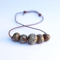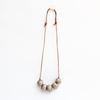 - MEDIUM: (pictured second) White shiny glaze with darker/bigger speckles on medium speckled stoneware clay with dark brown natural leather cord